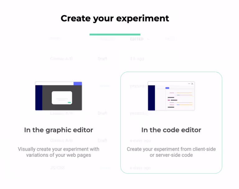 To build your A/B test in Kameleoon, log into the Kameleoon App. On the homepage, click on “New Experiment”. Then select “In the Code Editor” experiment.