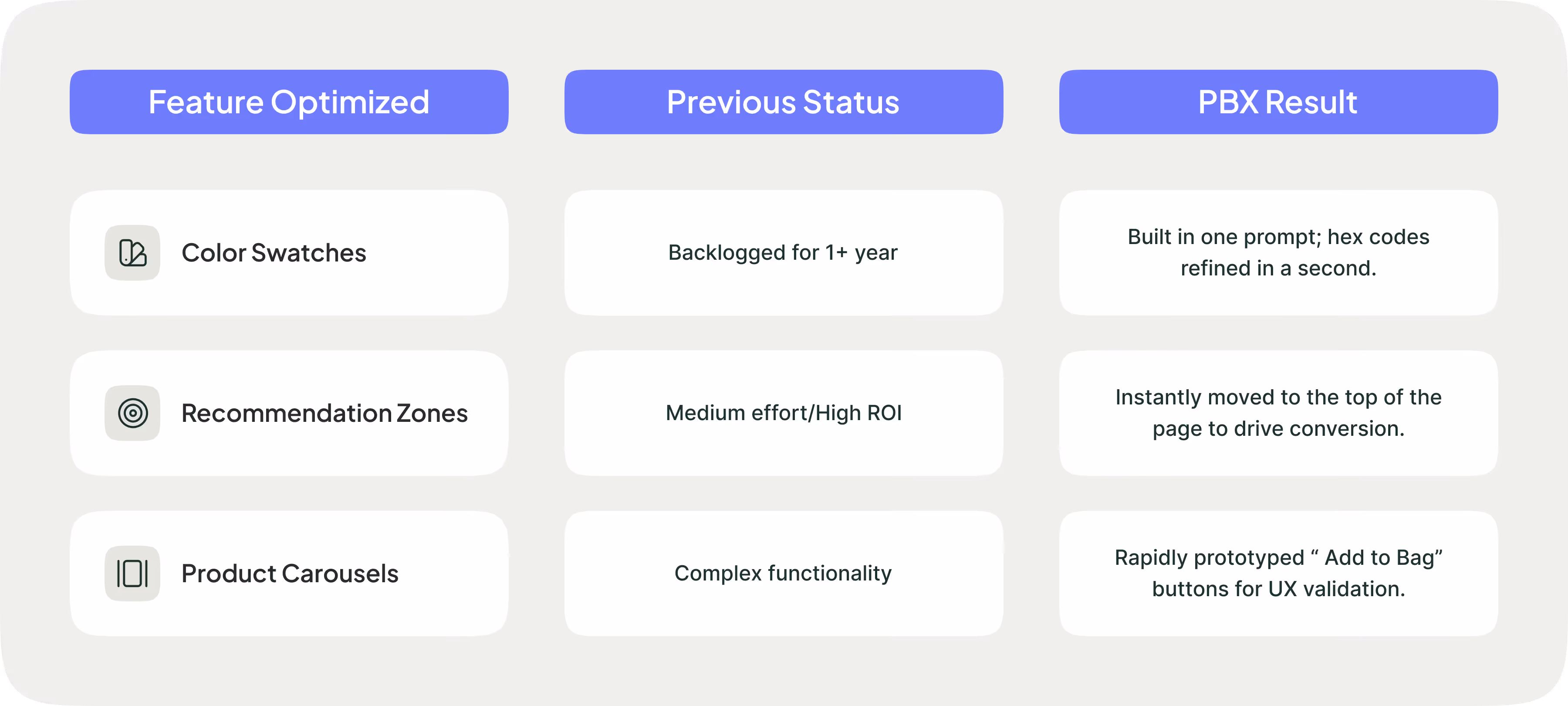- Collaborative Governance: PBX allows UX and brand teams to provide feedback on existing variants without needing to add them into their workflow, increasing collaboration without increasing workloads.