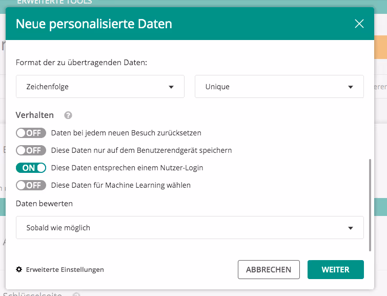 Um die Custom Data zu erstellen, müssen Sie nur noch „Diese Daten entsprechen einer Besucher-ID“ ankreuzen. Fertig!