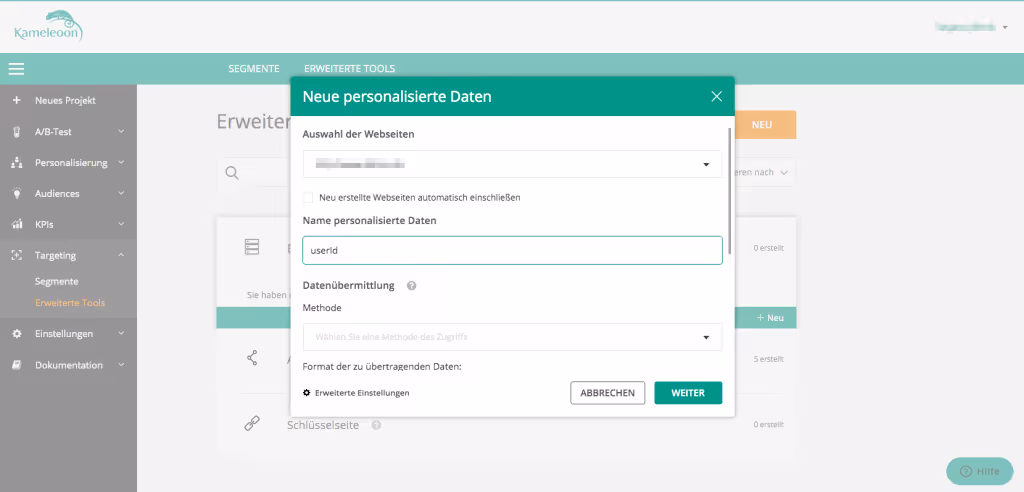 Diese Informationen können mit Kameleoon genutzt werden, z.B als Targetingkriterien eines Tests oder einer Personalisierung oder zur Aufschlüsselung von Ergebnissen im Reporting. Die Daten können im Back Office eingerichtet werden (Targeting > Erweiterte Tools > Custom Data).