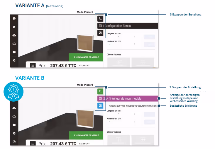 Der Hersteller personalisierter Möbel führte einen AB-Test seiner Produktseiten durch. Die Version mit Farbgliederung und zusätzlichen Erklärungen erzielte eine Steigerung der Bestellungen um 325%.