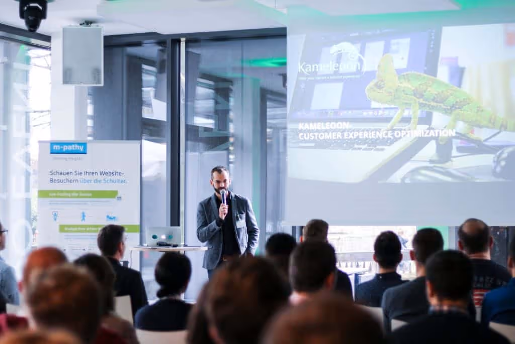 Am Nachmittag ging es dann an die Arbeit, mit interessanten Vorträgen über Webseiten-Optimierung durch A/B-Testing, Personalisierung und qualitative Analysen. Nach der Begrüßung durch unseren Kameleoon-Geschäftsführer Michael Witzenleiter, Kameleoon CEO Jean-René Boidron und m-pathy Teamlead Sales & Marketing Daniel Hujer gewährte uns Usability-Spezialist und Buchautor Frank Puscher in seinem Vortrag „Ist der Traum vom 1:1-Marketing ein Alptraum“ Einblick in die vielfältigen Möglichkeiten der Personalisierung und widmete sich der Frage, was mögliche Konsequenzen einer Über-Personalisierung sein können. Daran anknüpfend verriet uns Bastian Weber, Product Consultant bei m-pathy, worauf es beim richtigen A/B-Testen ankommt und welch wichtige und unverzichtbare Rolle die Aufzeichnung und Analyse von Mausspuren und Touch-Gesten für die Priorisierung der Tests spielen. Ein Beispiel aus der Praxis bekamen alle Zuhörerinnen und Zuhörern von Pixum CTO Marc Rendel. Er illustrierte Schritt für Schritt, wie das erfolgreiche Internetunternehmen mit Hilfe von A/B-Tests seine Erfolgsquote bedeutend steigerte und gab hilfreiche Tipps mit auf den Weg. Schließlich betrachtete Michael Witzenleiter das Thema der Conversion-Optimierung aus der strategischen Perspektive und verdeutlichte, welch enorme Erfolgssteigerung Unternehmen durch eine geschickte Verbindung von Analytik und Kreativität erzielen können.