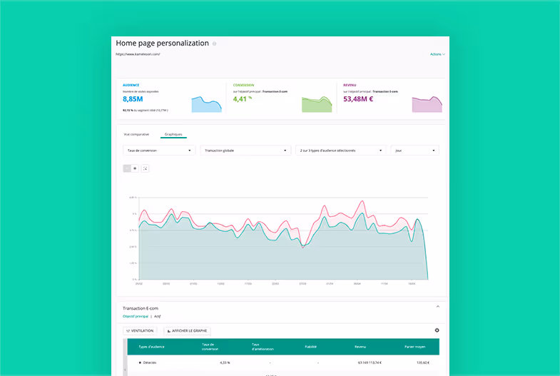 Für ein hohes Level an Effizienz ist eine schnelle und einfache Lektüre der Personalisierungs-Performance unabdingbar. Ein Blick auf die Ergebnisseite von Kameleoons Personalisierungsmodul reicht, um zu sehen, ob eine Personalisierung „funktioniert“, und wie sich ihre Haupt-KPIs entwickeln.