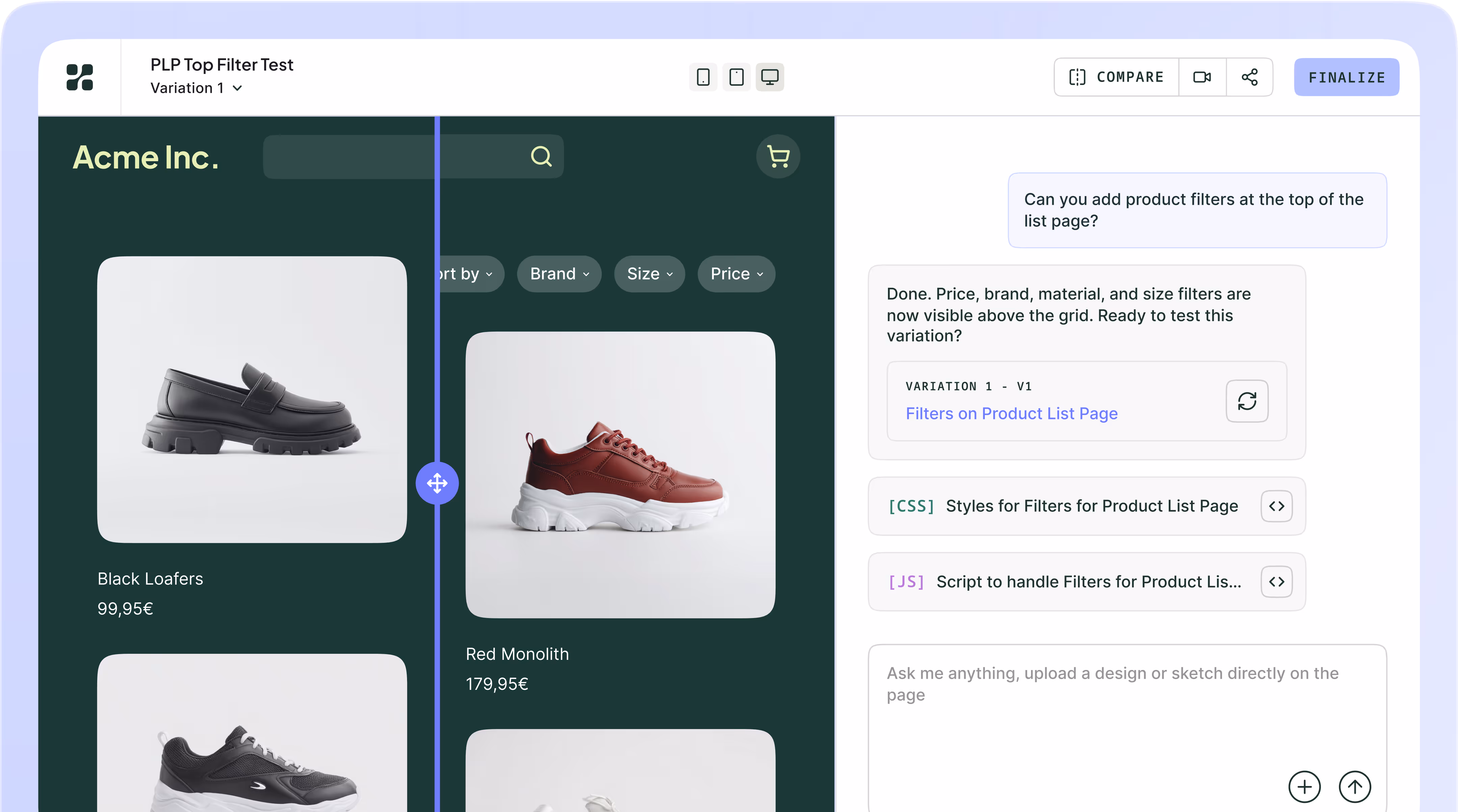 Formuliere deine Idee in natürlicher Sprache und starte dein Experiment sofort. Egal ob Copy oder Layout, alles ist möglich.