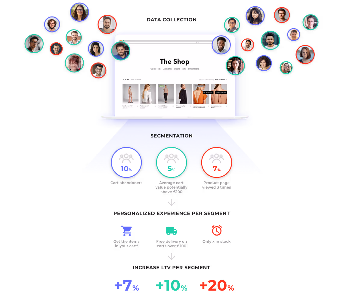 Personalization enables you to meet each visitor’s expectations, trigger conversions and also increase performance (by improving the average customer spend) or accelerating conversion speed thanks to delivering the right messages at the right time.