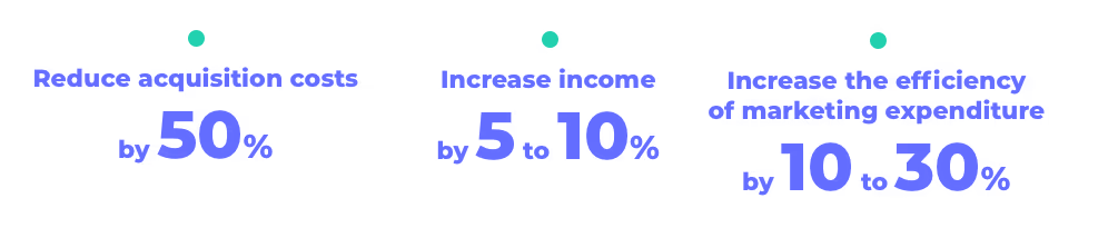 With personalization, the impact on ROI is immediate. By correctly targeting offers and messages, it is possible to reduce acquisition costs by 50% while income increases by 5 to 10%. Marketing campaign spend is optimized while you obtain better results for the actions you take—for example, discount coupons are solely targeted to undecided visitors rather than being offered to those who would convert anyway.