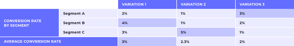 - if we choose the best possible variation for the three segments (variation 1 here) we see an average +3% increase in conversions (being an average of 2%, 4% and 3%)