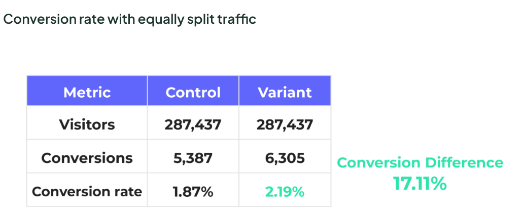 This equal allocation helps ensure that any differences in performance are caused by the change itself, not by differences in who was exposed to each version.