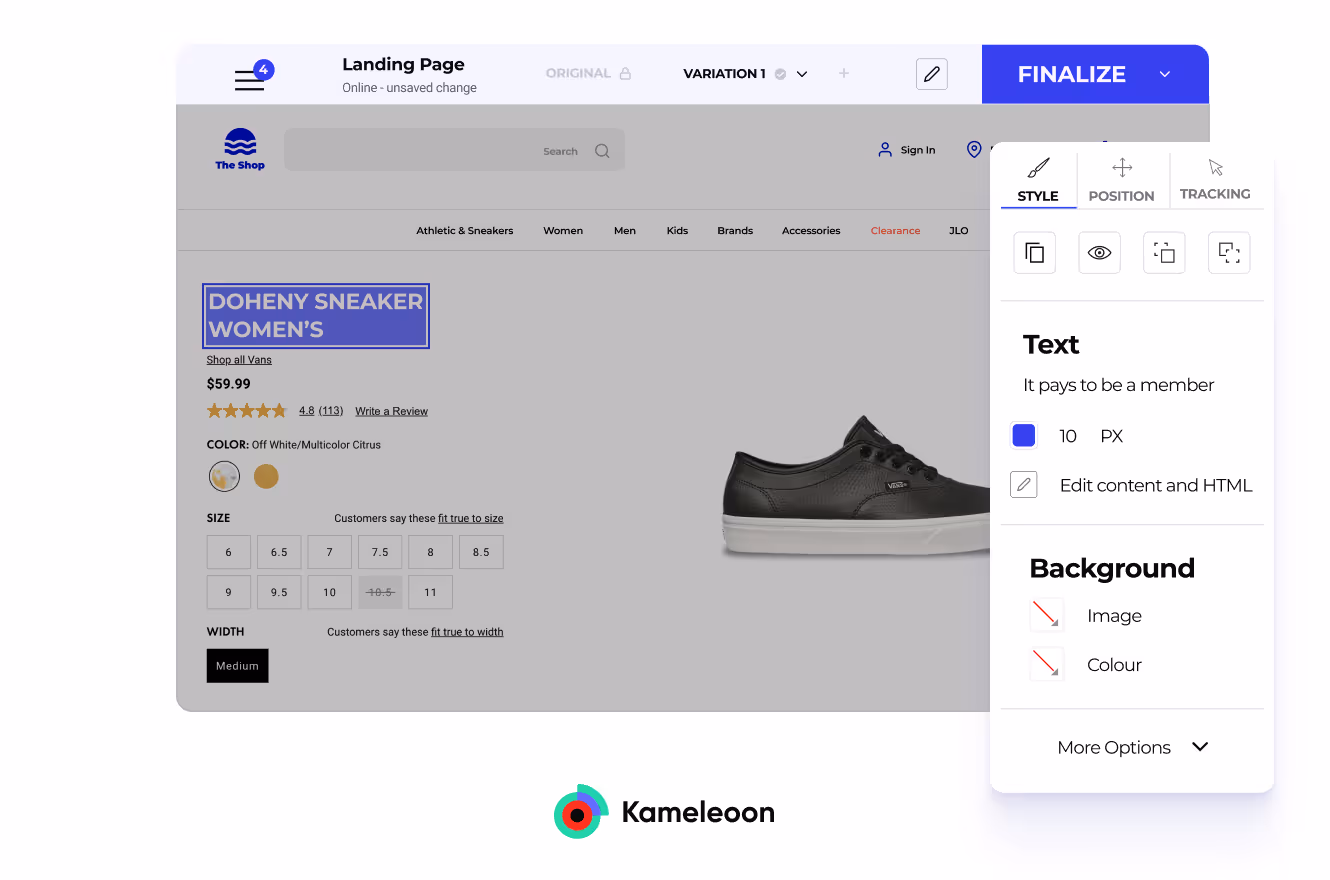 Chez Kameleoon, notre outil d’A/B testing intègre un éditeur graphique permettant de modifier facilement n’importe quel élément de votre landing page. Même des changements complexes peuvent être réalisés en quelques clics. Plus besoin de solliciter un webdesigner ou un développeur.