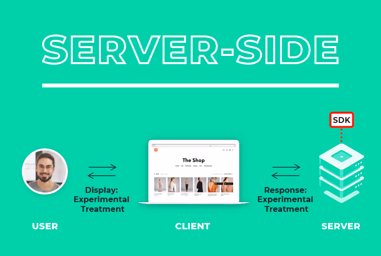 Travailler en Server-Side consiste à tester ses hypothèses d’optimisation du côté de son architecture back-end plutôt que via le navigateur de vos visiteurs (A/B testing client-side via un tag JavaScript). Là où notre framework JavaScript modifie a posteriori les pages HTML une fois celles-ci générées par le serveur via les APIs standard de manipulation DOM (client-side testing), nos SDKs serveur vous permettent de produire ces modifications directement au moment de la génération des pages HTML (Server-Side testing).