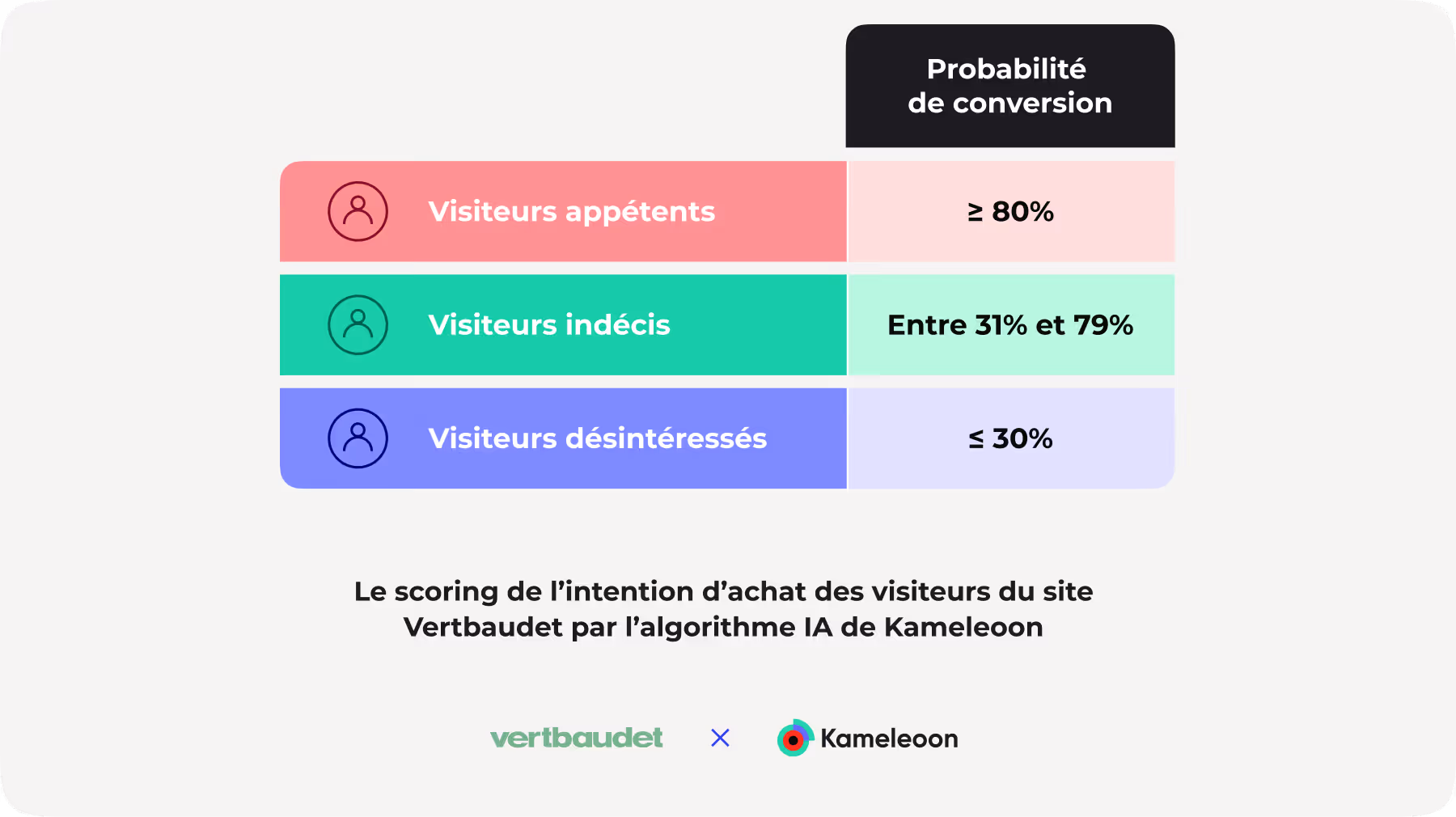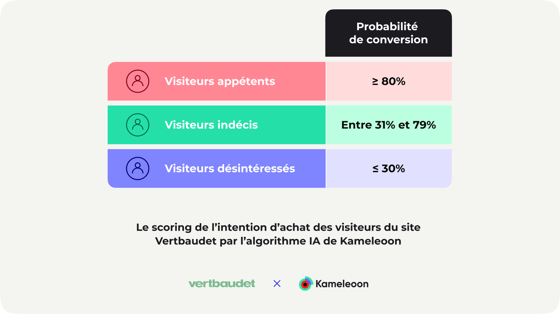 Les équipes de Vertbaudet décident d’utiliser l’algorithme IA Kameleoon pour calculer l'appétence de chaque visiteur. En fonction de leur comportement, l’algorithme crée des corrélations entre chaque profil et évalue en temps réel l’intention d’achat du visiteur.