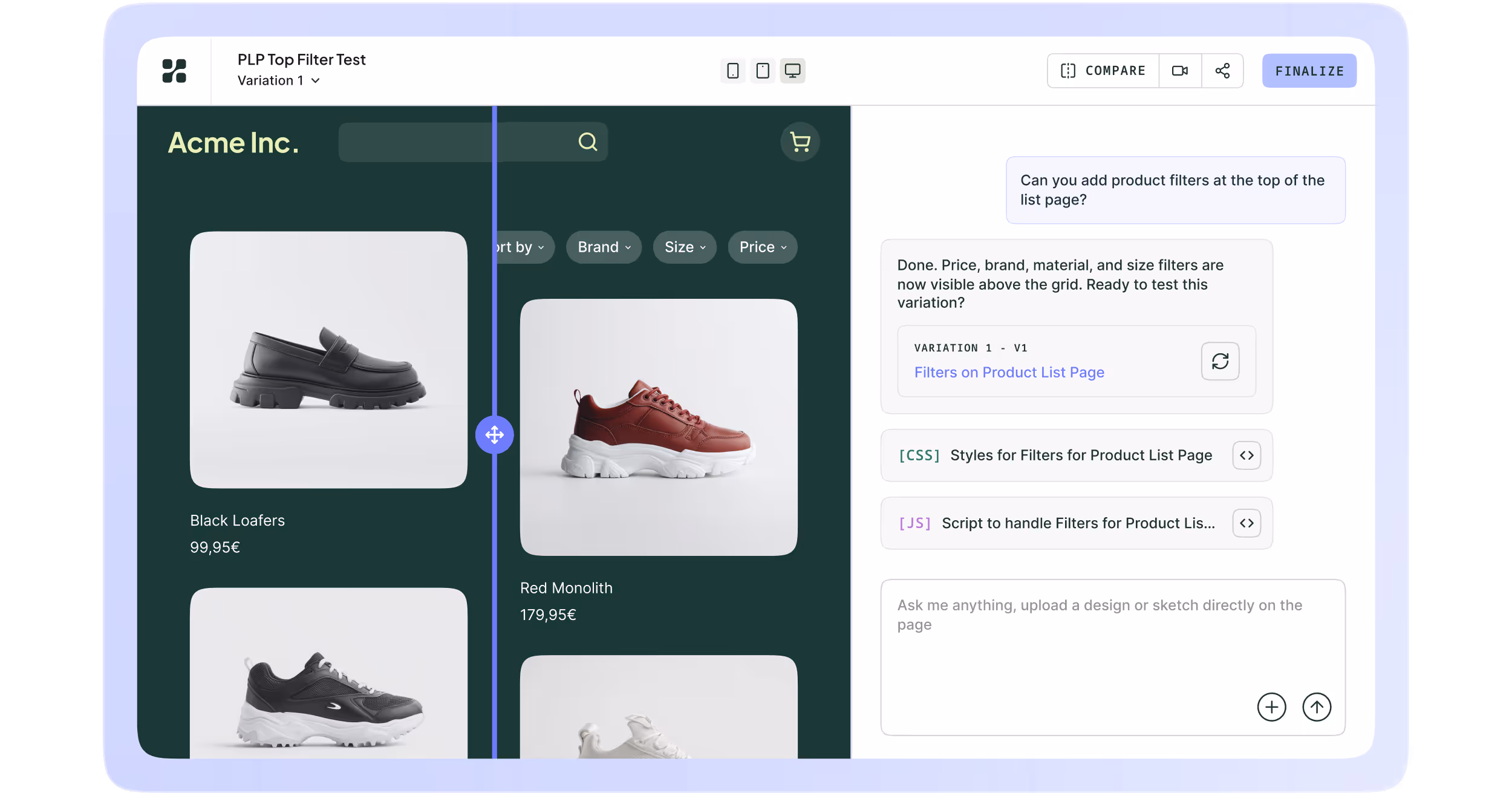 Oui, exactement. Comme le code en direct, PBX vous permet de créer de nouveaux prototypes web simplement en discutant avec l’IA. Vous pouvez ensuite les tester directement sur vos visiteurs réels. Le fait de construire des variantes et de les tester en dialoguant avec l’IA correspond à ce que nous appelons l’expérimentation web.
