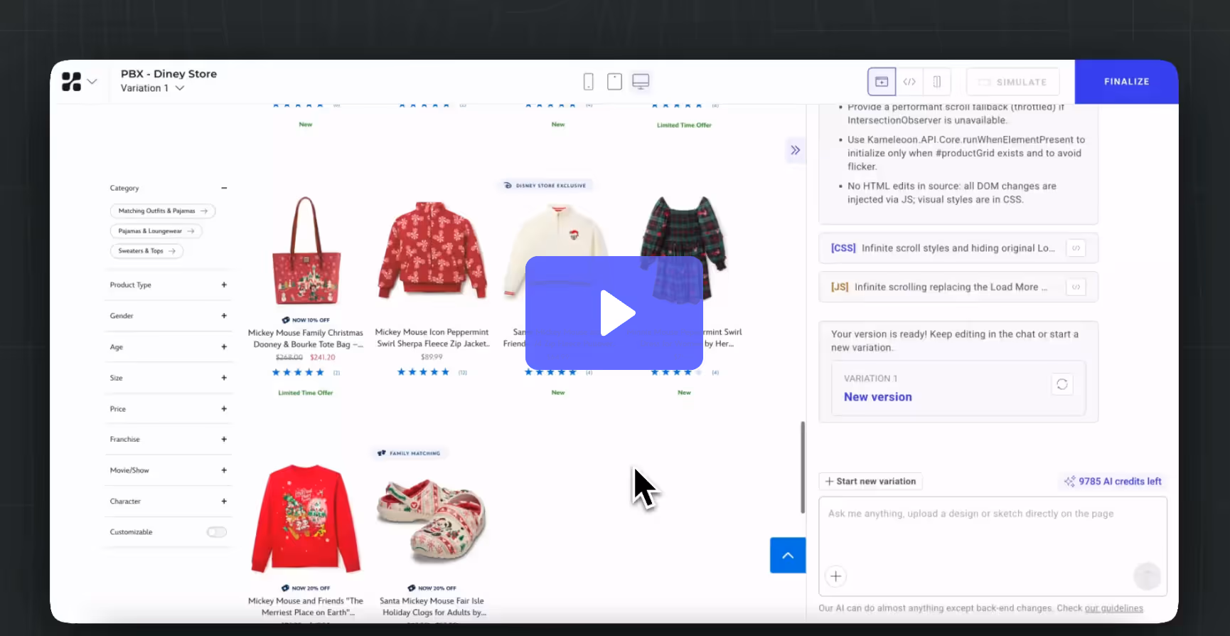 Le Prompt-Based Experimentation (PBX) est l’approche de Kameleoon pour l’expérimentation web : une nouvelle façon d’identifier, configurer et lancer des tests. Avec PBX, vous décrivez simplement en langage naturel les changements que vous souhaitez tester. L’IA génère alors une variation et lance le test, sans code ni éditeur WYSIWYG.