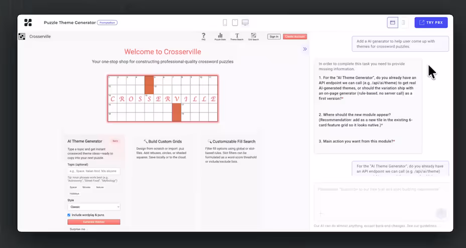 I enjoy constructing crossword puzzles, but I often struggle with coming up with themes for the puzzles. The puzzle generator I use is great for constructing puzzles, but would be much greater if it also offered suggestions for themes.