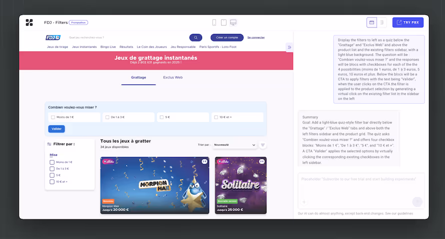 Prompt-Based Experimentation (PBX) is Kameleoon’s approach to vibe experimentation; a new way to ideate, configure, and launch experiments. With PBX, you simply describe the web changes you want to test in natural language. AI then generates a variation and launches the experiment, without code or WYSIWYG editors.