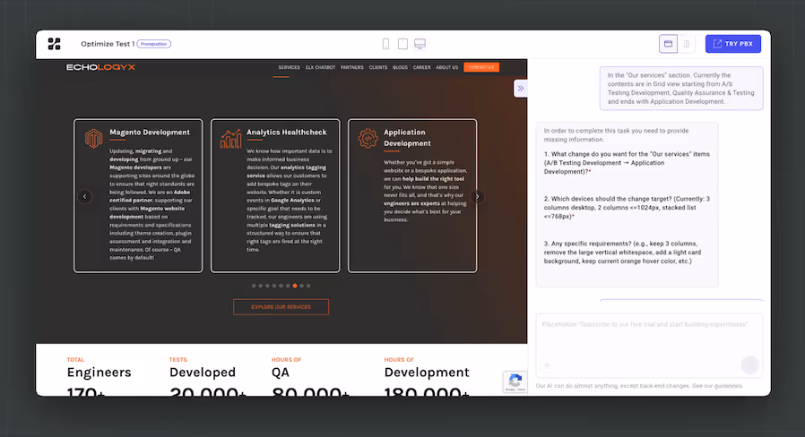 No. PBX helps you create test-ready experiment versions by chatting with AI, but it’s not a replacement for your design or CMS tools. You can still upload a mockup to improve output quality, and a Figma integration is planned for later in Q1 2026.